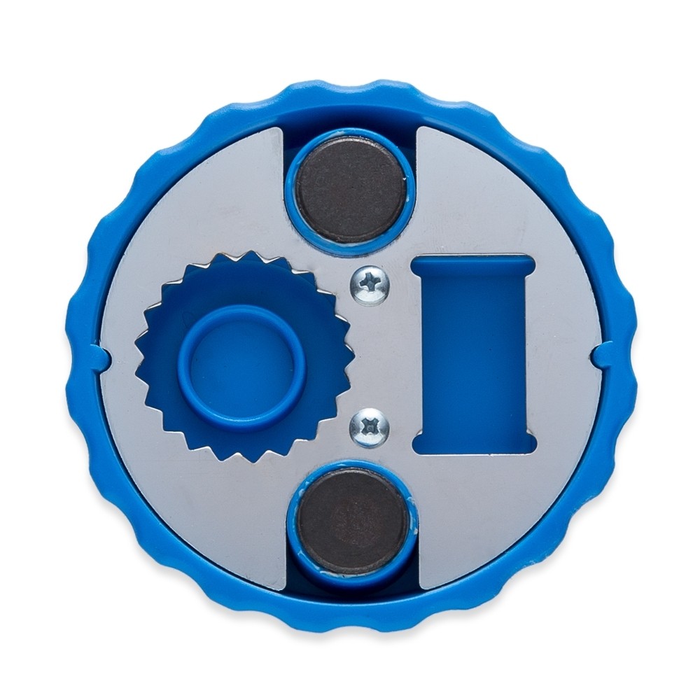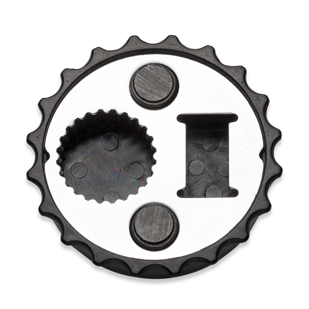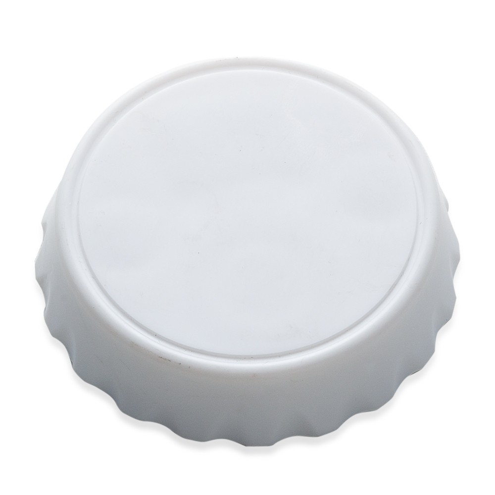 Abridor formato tampa de garrafa com imã para geladeira, contém dois tipos de abridores de garrafa.
