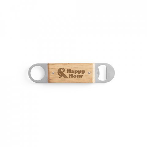 Abridor de garrafas em aço inox com corpo em madeira de faia. Distintivo dos restantes por conter um abridor de um lado e uma argola para facilitar sua arrumação. A cor e o resultado da impressão nos materiais naturais pode variar entre produtos. 40 x 180 x 10 mm