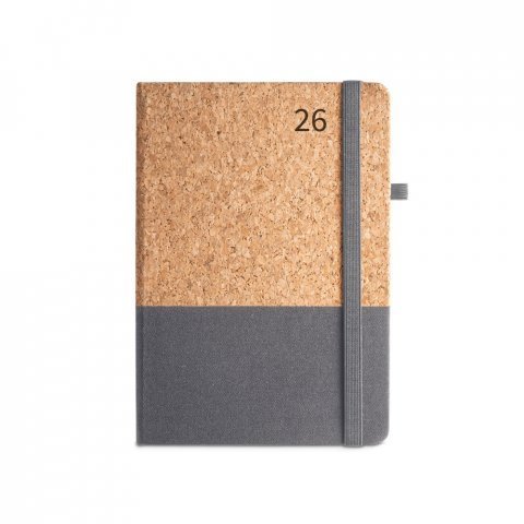 Agenda B5 em cortiça e linho. Possui um suporte para esferográfica (não inclusa), marcador em fita e elástico para fecho na mesma cor. Está organizada num plano diário (70 g/m²). Fornecida com bolsa de non-woven. 148 x 210 mm | Bolsa: 205 x 250 mm Agendas 2026 Novidades