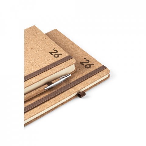 Agenda A5 em cortiça. Possui um suporte para esferográfica (não inclusa), miolo em cor marfim e marcador em fita. Está organizada num plano diário (70 g/m²). Fornecida em bolsa de non-woven. 148 x 210 mm | Bolsa: 205 x 250 mm Agendas 2026 Novidades