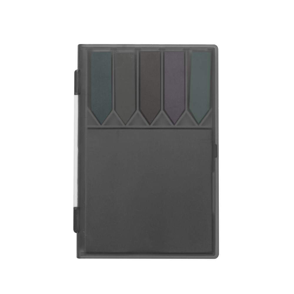 Bloco de anotações plástico com autoadesivos, capa colorida e base branca. Possui cinco bloquinhos autoadesivos com aproximadamente 50 folhas cada e um bloco maior com folhas amarelas sem pauta, aproximadamente 50 folhas. Especificações: - Medidas aproximadas para gravação(CxL)  7,5 cm x 12 cm - Tamanho total aproximado(CxL)  13,1 cm x 8,9 cm - Peso aproximado(g)  77