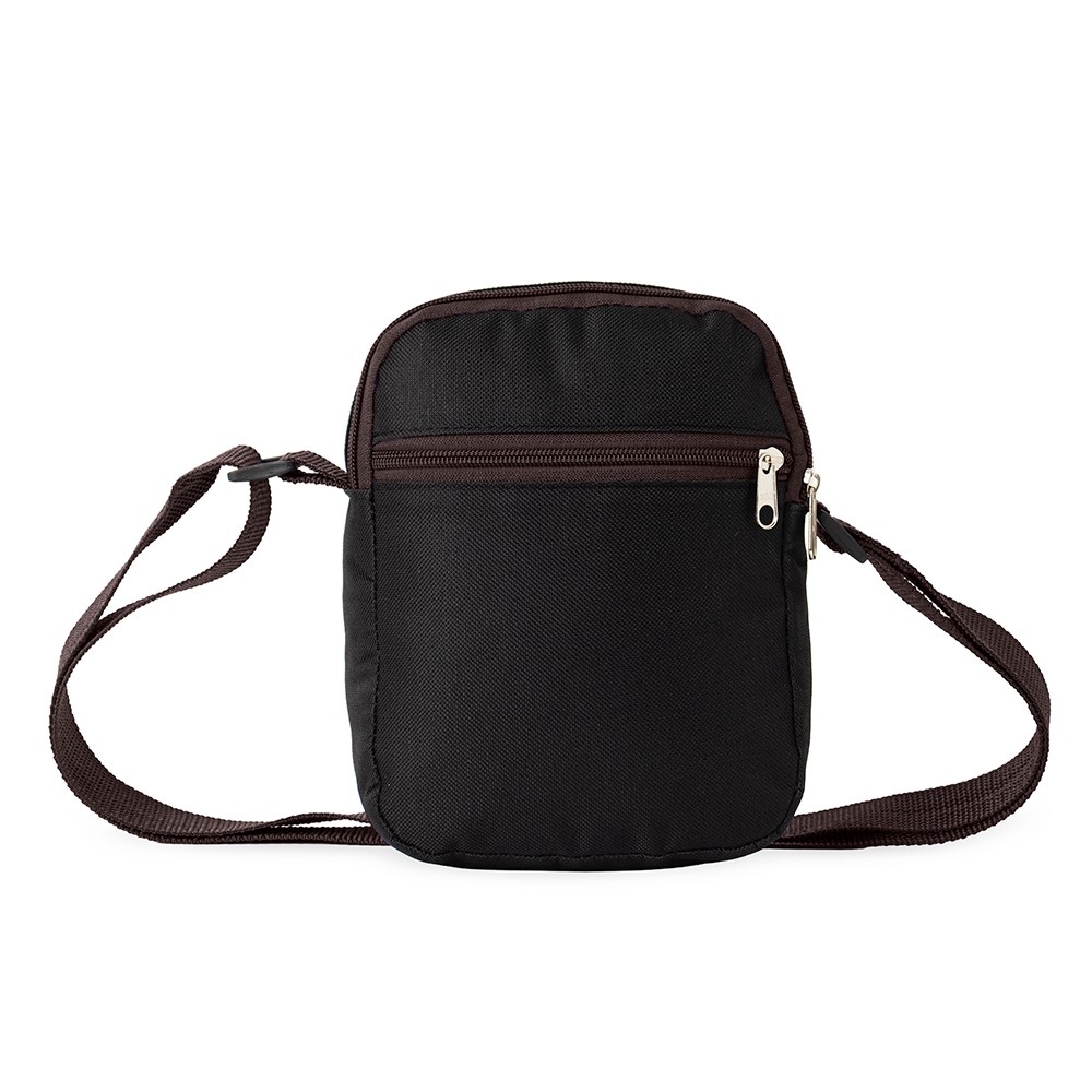 Bolsa de ombro em nylon com dois compartimentos, sendo o principal com bolso interno telado. Possui alça com opção de regulagem.