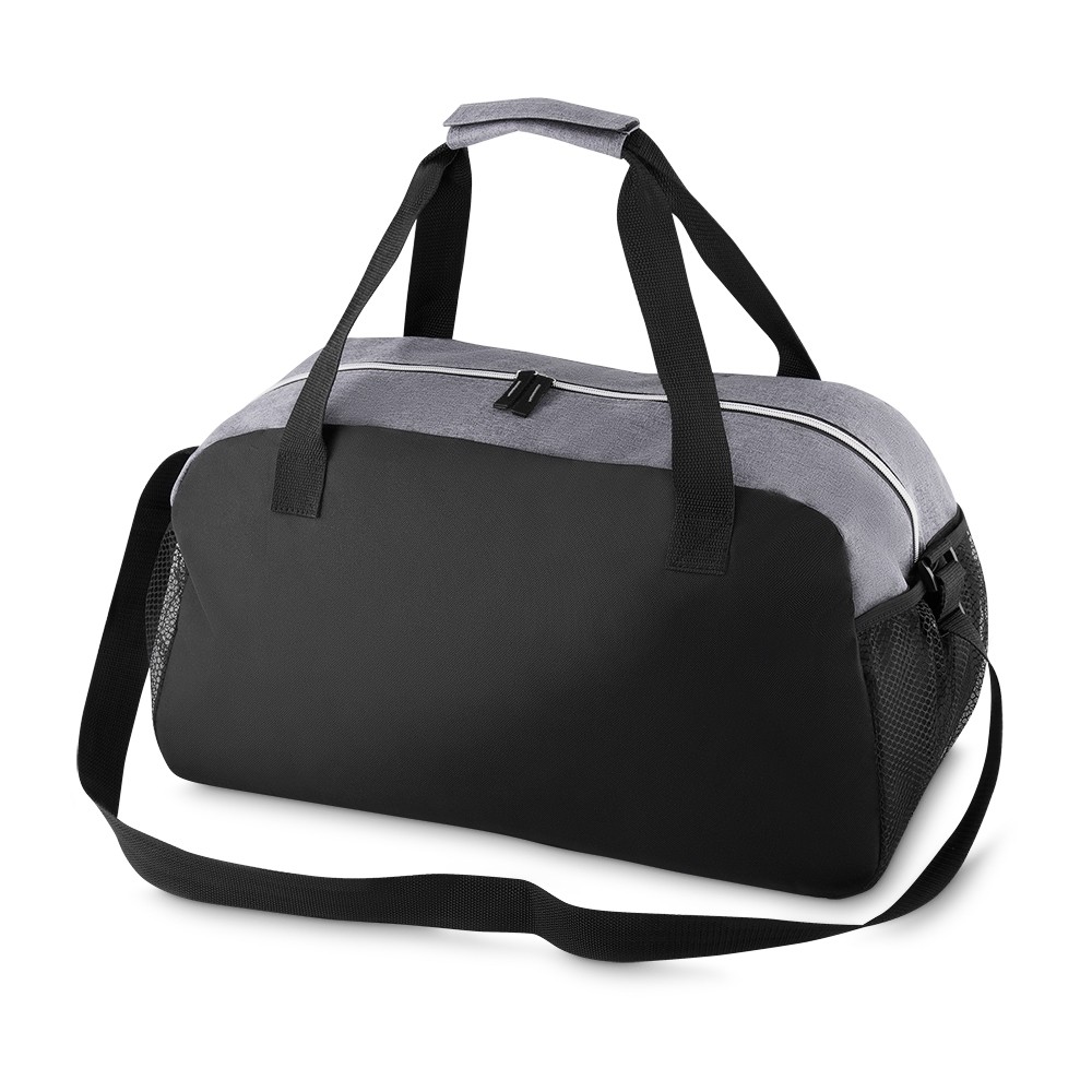 Bolsa esportiva de poliéster. Possui alça de mão com pegador cinza de velcro, alça ajustável para as costas e bolsos laterais de malha.