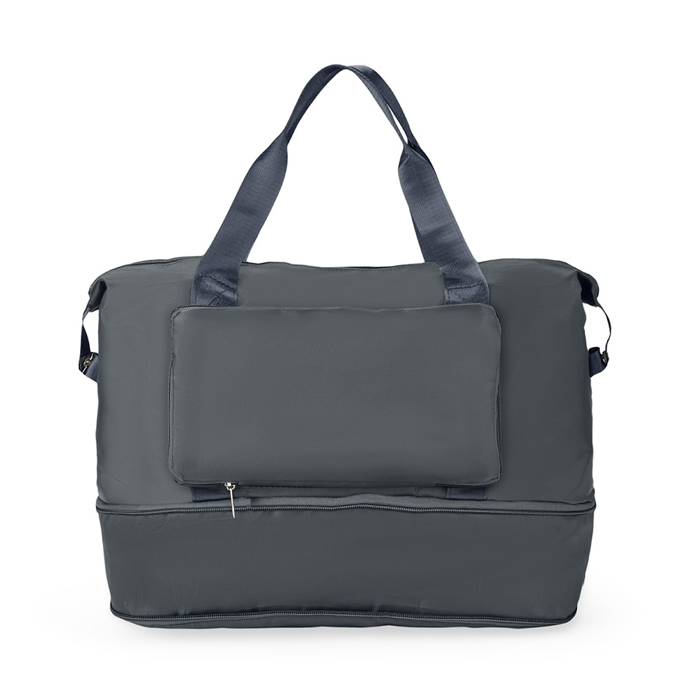 Bolsa expansível em poliéster impermeável com capacidade de até 30 litros, obtida a partir da abertura do compartimento inferior, com fechamento em zíper. Possui um par de alças em nylon, dois compartimentos internos, incluindo bolso com espaço para encaixe em alça de malas. Pode ser dobrada para facilitar o transporte quando não estiver em uso.