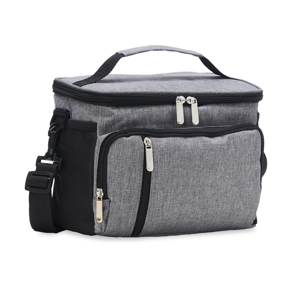 Bolsa térmica de poliéster com três compartimentos, capacidade de 11 litros. A bolsa possui revestimento térmico em PEVA atóxico com costura soldada (não vaza), alça de mão, bolsos laterais telados e acompanha alça transversal.