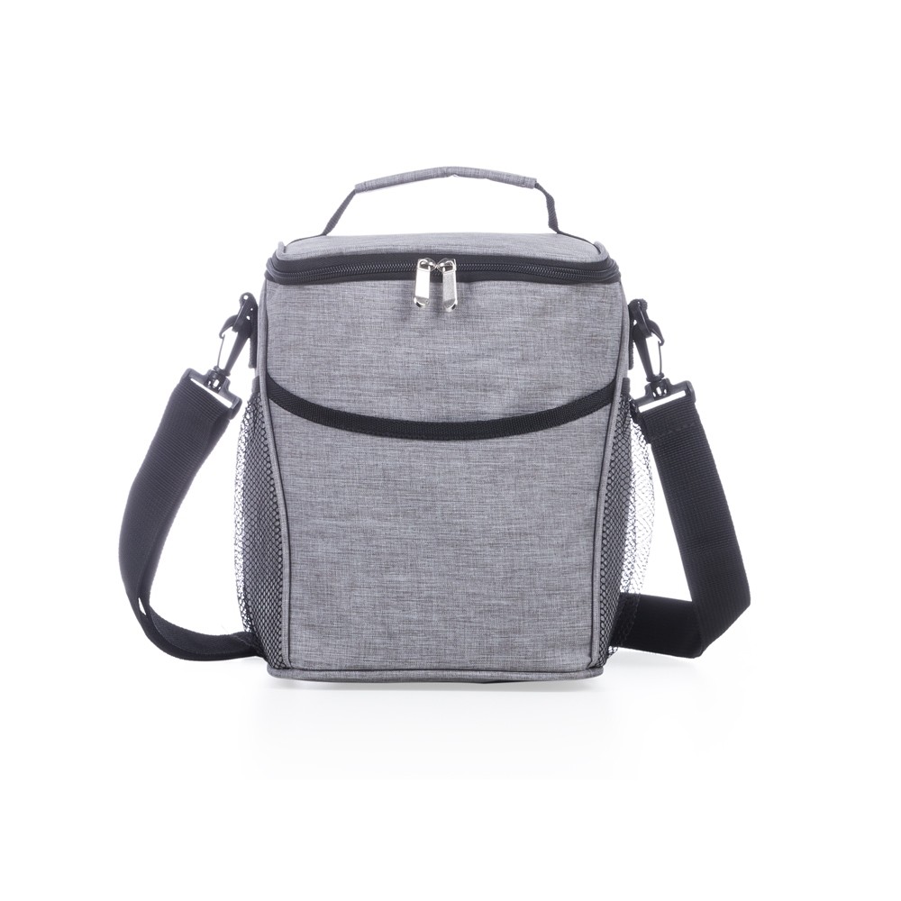 Bolsa térmica 12 litros de material poliéster com detalhes em nylon. Abertura superior, possui bolso frontal, dois bolsos de rede nas laterais, fivelas nas laterais para utilização/encaixe da alça de ombro e alça superior.