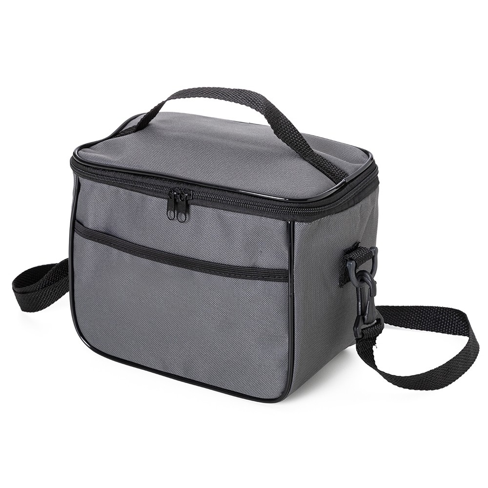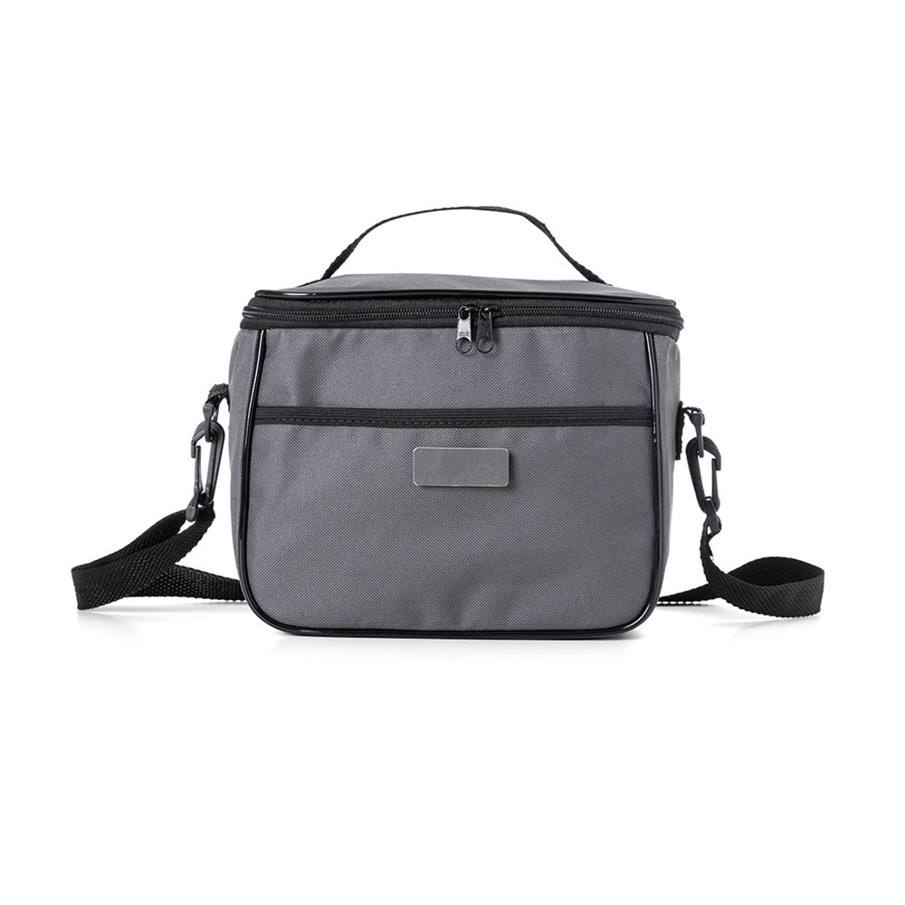 Bolsa térmica 6 litros com bolsos externos e alça de mão em nylon, contém bolso frontal aberto e bolso traseiro com zíper. Acompanha plaquinha metálica e alça transversal regulável com mosquetões para encaixe nas fivelas laterais da bolsa. Especificações: - Altura  19 cm - Largura  24 cm - Profundidade  14,5 cm - Medidas aproximadas para gravação(CxL)  1,7 cm x 3,5 cm - Peso aproximado(g)  212