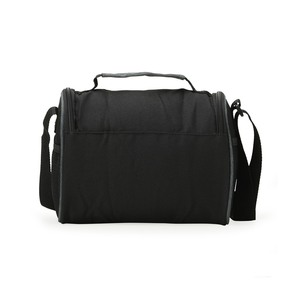Bolsa térmica de poliéster com dois compartimentos, capacidade de 7 litros. A bolsa possui revestimento térmico em PEVA atóxico, alça de mão, bolsos laterais telados e alça transversal.