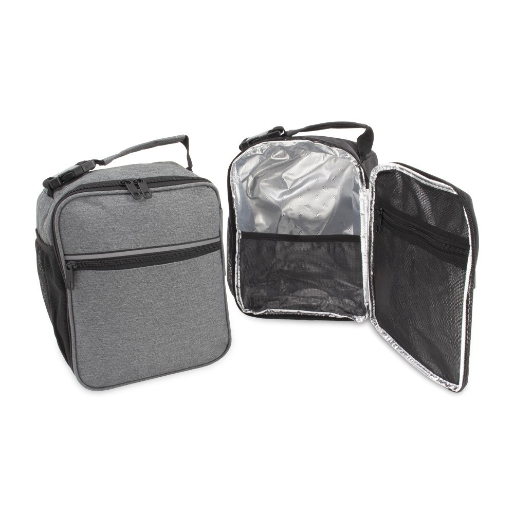 Bolsa térmica de nylon com dois compartimentos, capacidade de 8 litros. Com bolso telado e tela média de proteção interna, a bolsa possui uma faixa frontal refletiva, bolso lateral telado e alça de mão com fivela de encaixe. Especificações: - Altura  25 cm - Largura  20,5cm - Profundidade  10,5 cm - Medidas aproximadas para gravação(CxL)  15 cm x 19 cm - Peso aproximado(g)  319