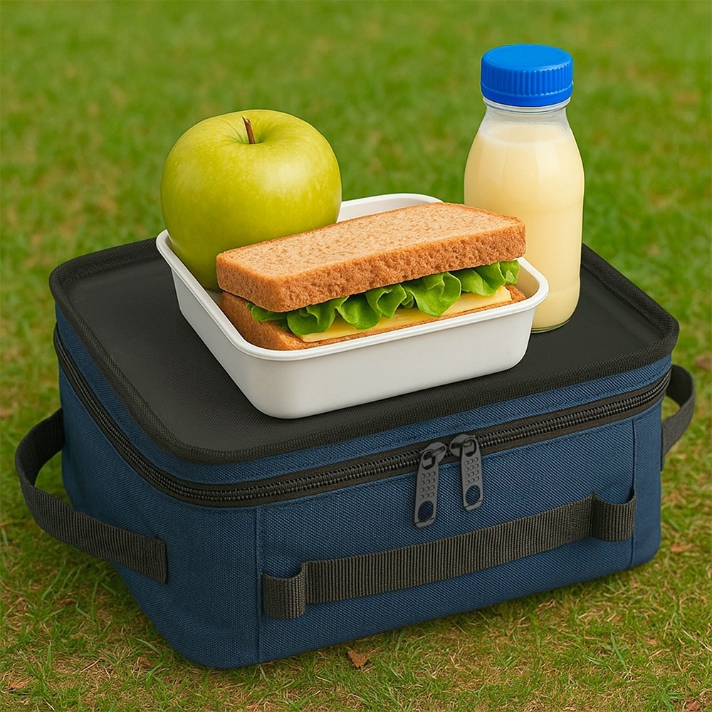 Bolsa térmica compacta feita em poliéster resistente à água com capacidade máxima de 9 litros. Apresenta revestimento térmico interno em PEVA atóxico, o que possibilita a conservação da temperatura de alimentos e bebidas por mais tempo. Conta ainda com alças laterais em nylon e tampa de base firme que pode ser usada como bandeja para refeições.