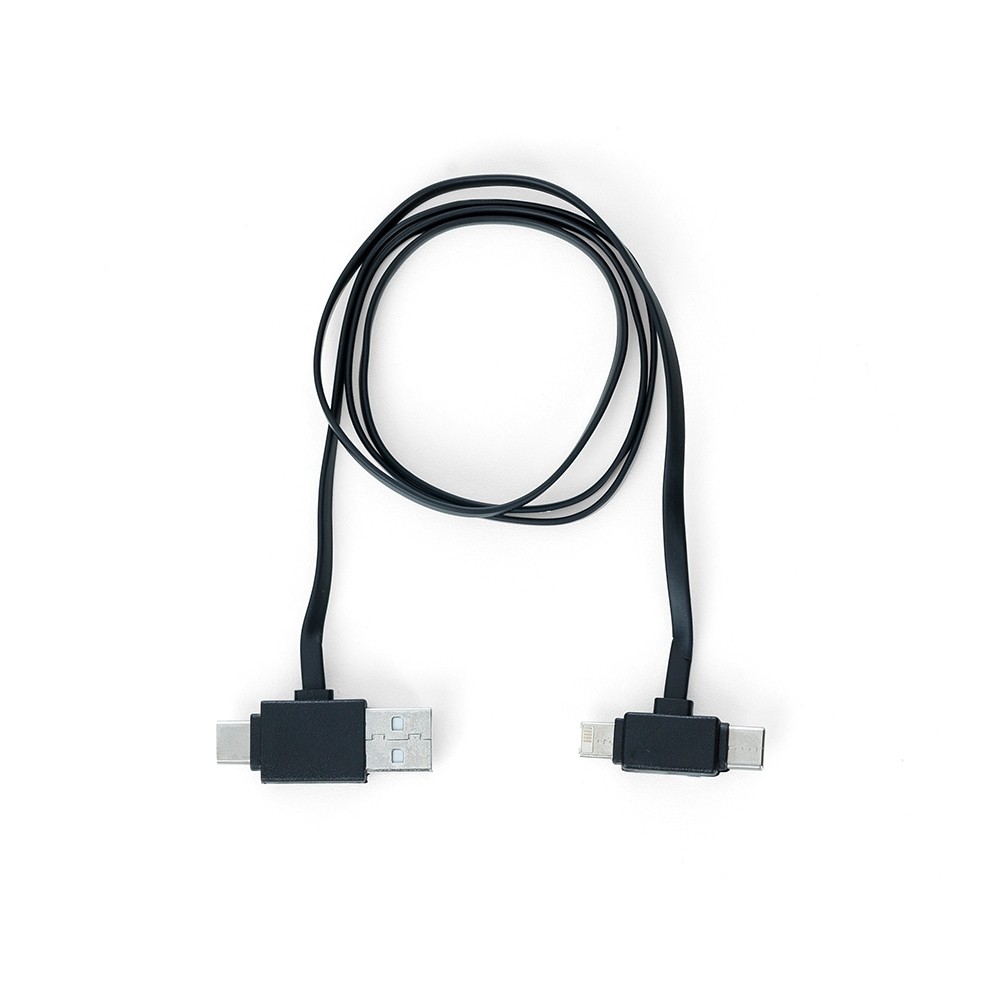 Cabo 4 em 1 com case suporte para celular. Cabo para carga e transferência de dados, contém as saídas tipo-C, lightning (iOS) e V8 (android) e entradas USB-A e USB-C.