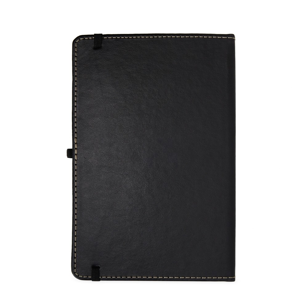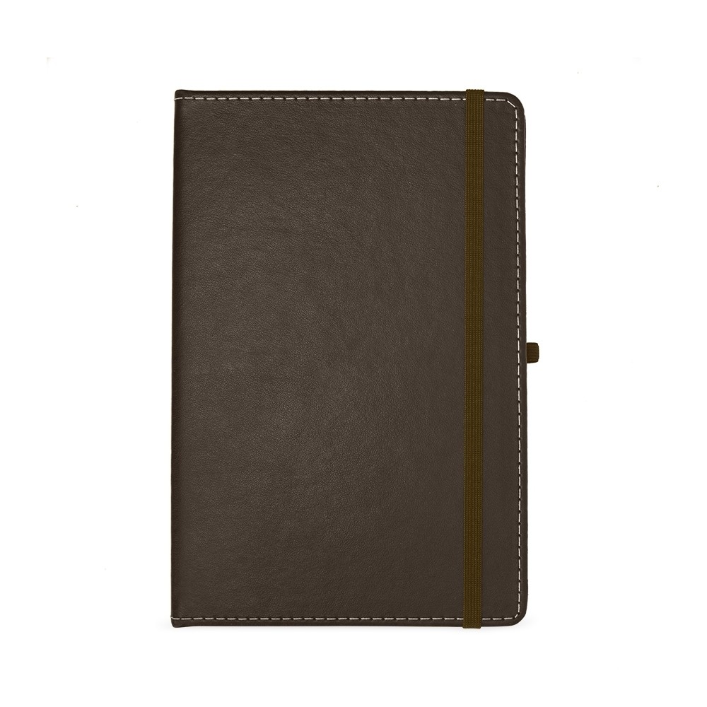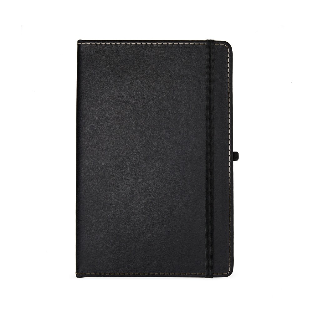 Caderneta em couro sintético com porta caneta, marca página em cetim e elástico para fecho. Contém aproximadamente 80 folhas brancas com pauta.