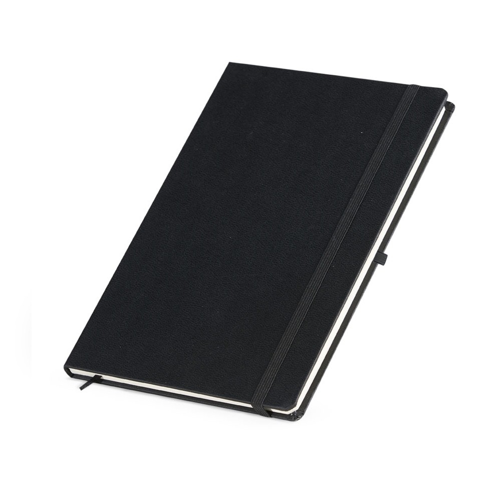 Caderneta em percalux com porta caneta, marcador de página em cetim e fita elástica para fechar. Contém aproximadamente 80 folhas com pauta.