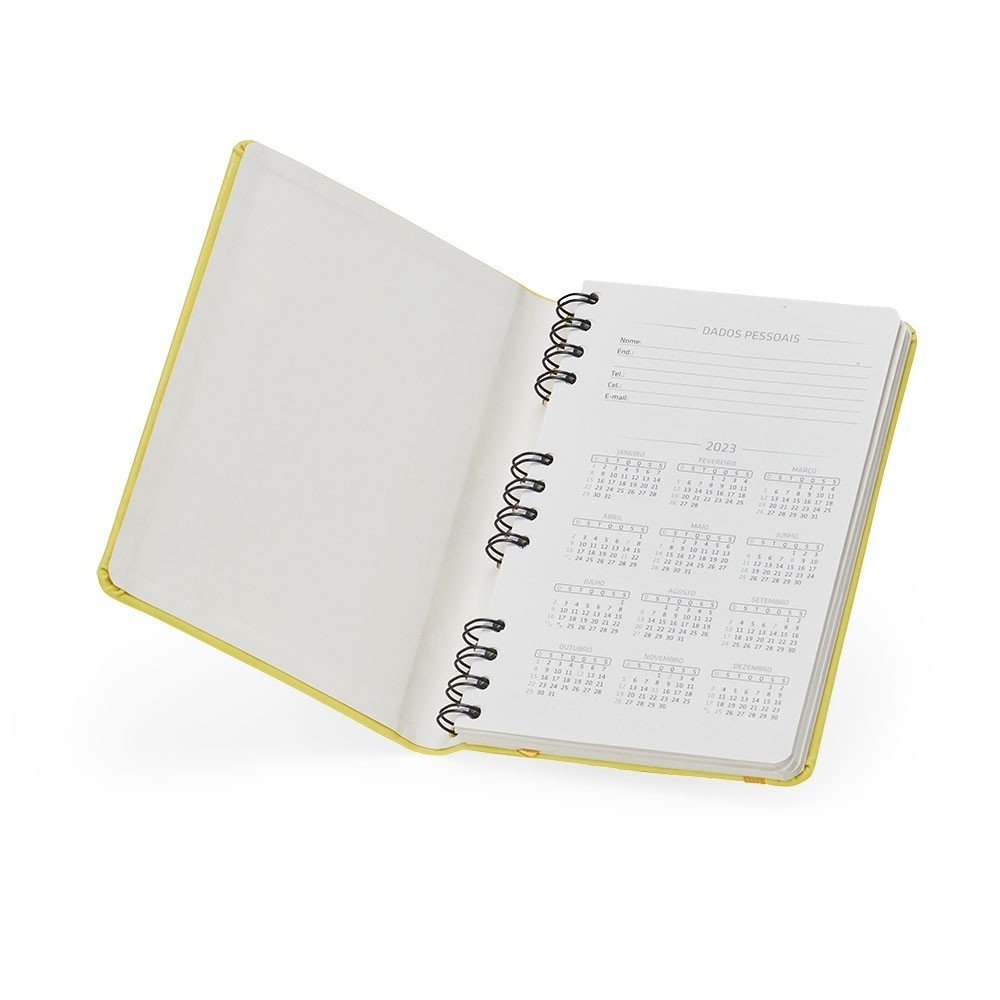 Caderneta emborrachada com wire-o, elástico para lacre e marcador de página em cetim. Possui páginas para dados pessoais, calendário de 2024 à 2026, página de contatos e aproximadamente 100 páginas em marfim com pauta. Especificações: - Altura  21,1 cm - Largura  14,4 cm - Espessura  1,9 cm - Medidas aproximadas para gravação(CxL)  19 cm x 12 cm - Peso aproximado(g)  321