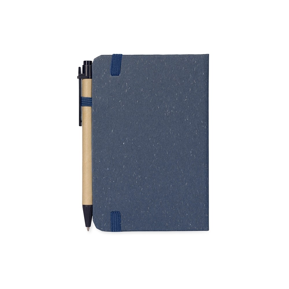 Caderneta ecológica de capa dura revestida em fibra de palha de trigo. Contém aproximadamente 80 folhas brancas com pauta, além de duas folhas de guarda, uma fita para fechamento e porta-canetas elástico. Acompanha uma caneta esferográfica de carga azul de 1,0mm com corpo em papelão e clip, acionamento por clique e ponteira em plástico.
