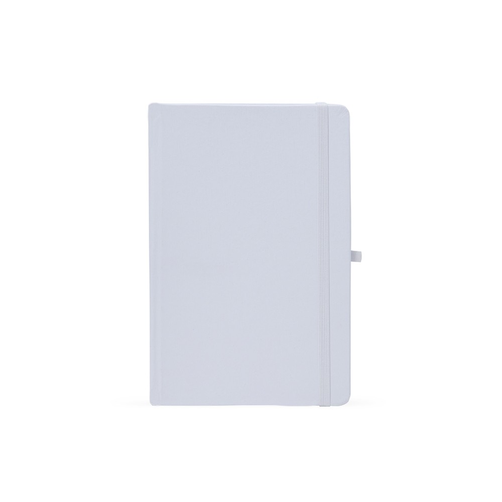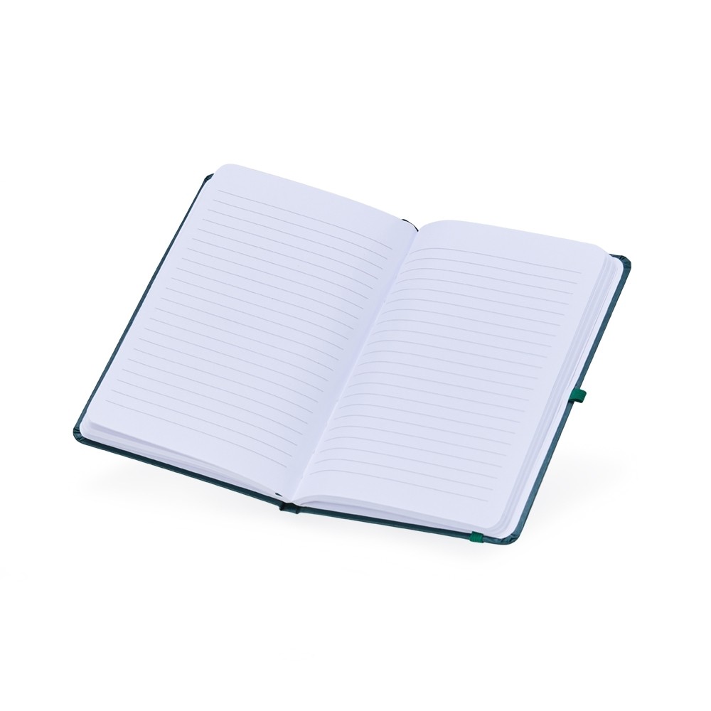 Caderneta em percalux escovado com suporte para caneta, elástico para lacre e marcador de página em cetim, contém aproximadamente 80 folhas com pauta na cor branca.