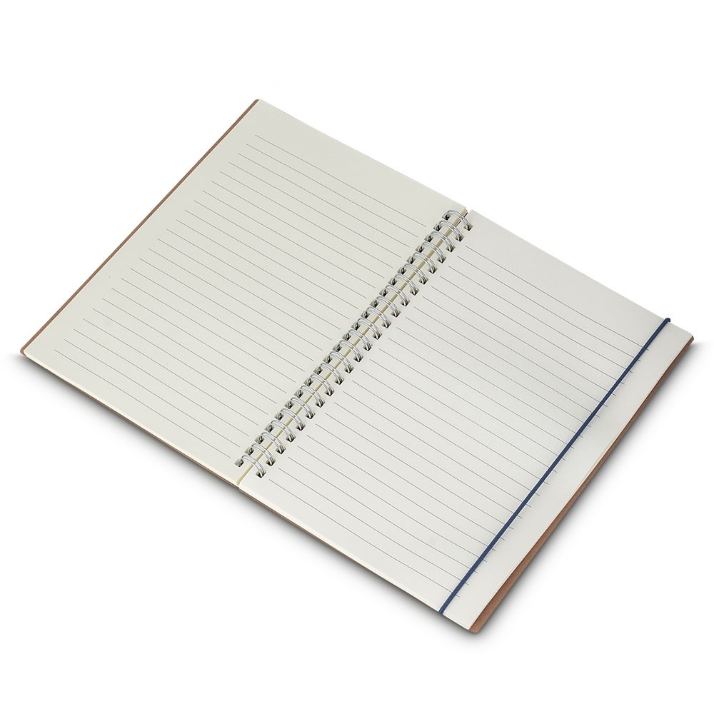 Caderno A5 com capa em papel 100% reciclado. Possui elástico para lacre, contém aproximadamente 70 folhas pautadas na cor bege e suporte para caneta de papel. Obs.: Não acompanha caneta. Especificações: - Altura  21 cm - Largura  15 cm - Espessura  1,6 cm - Medidas aproximadas para gravação(CxL)  8 cm x 11 cm - Peso aproximado(g)  177