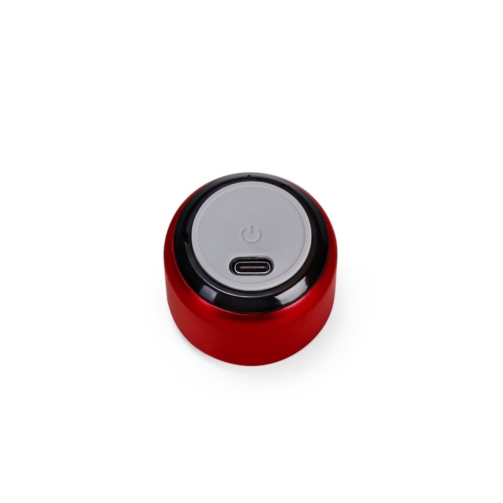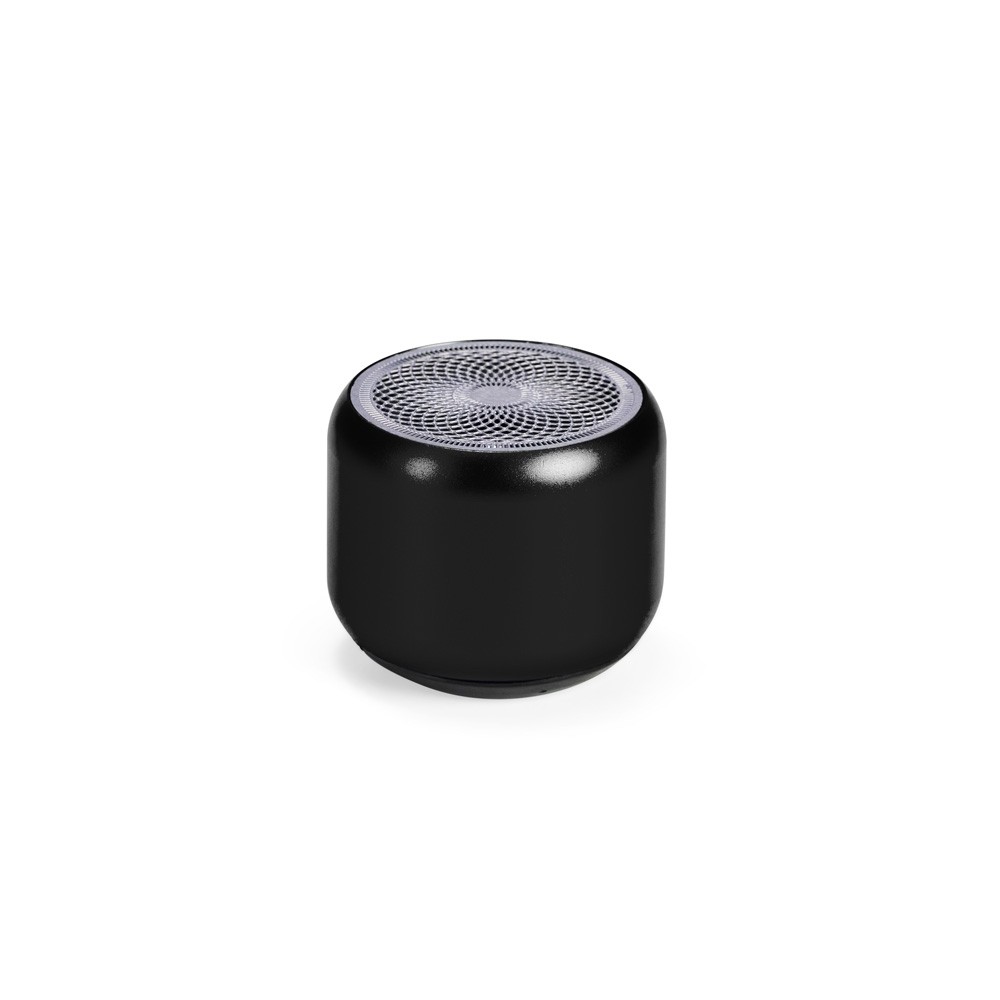Caixa de som com estrutura em metal e plástico. Possui base emborrachada com botão liga/desliga, conexão Bluetooth 5.0, autonomia de reprodução estimada de até 2 horas e meia e entrada USB-C para carregamento. Acompanha cordão de nylon e cabo USB-C.