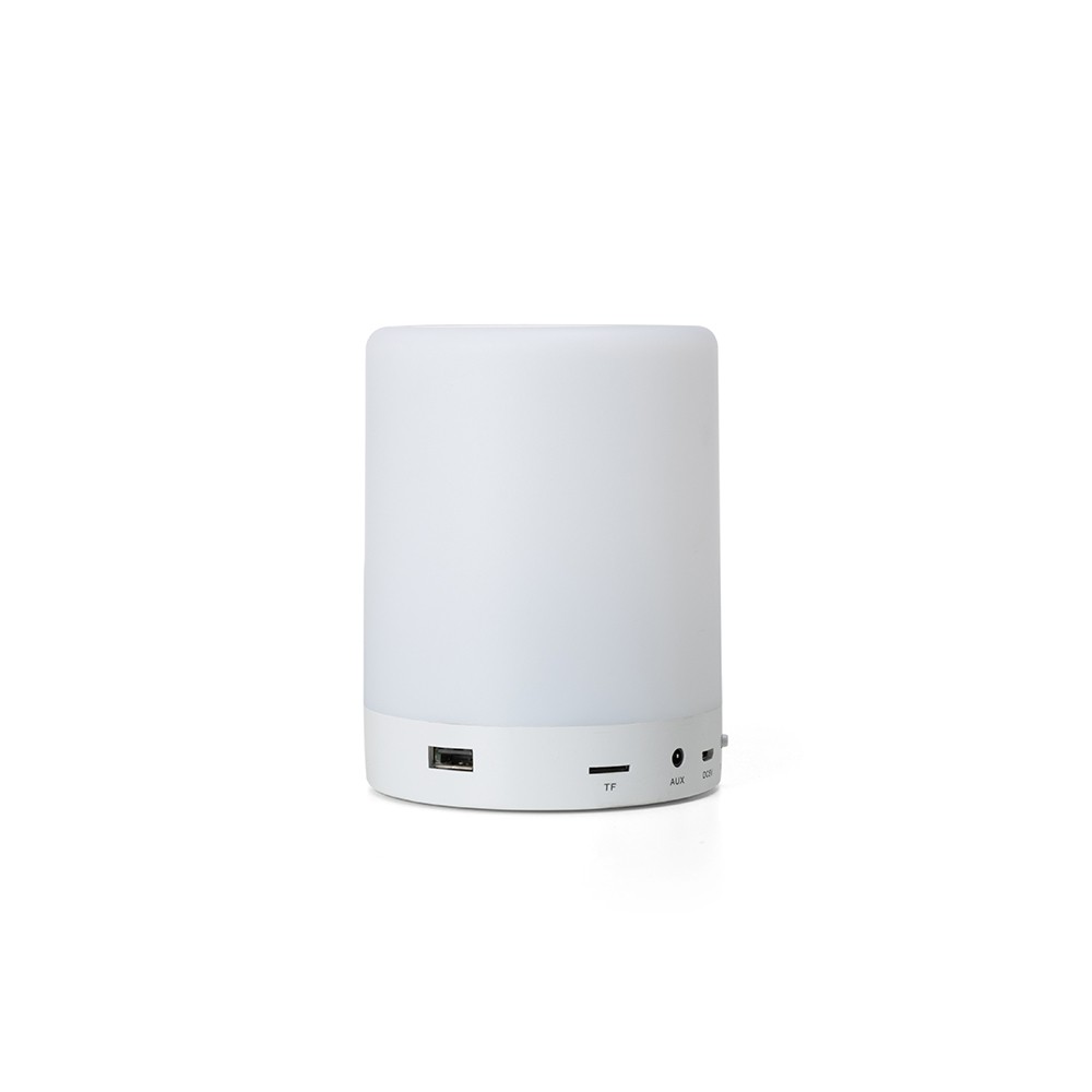 Caixa de som multimídia sem fio em plástico resistente com iluminação em LED acionadas por toque. Conta com painel de botões para troca de faixas e alternância de modos Bluetooth, Rádio FM e reprodução de MP3 via pen drive ou cartão MicroSD via entradas USB e cartão de memória. Possui ainda base com EVA antideslizante, alça de alumínio para transporte na parte inferior da caixa. Acompanha cabo Micro-USB e cabo Auxiliar P2.