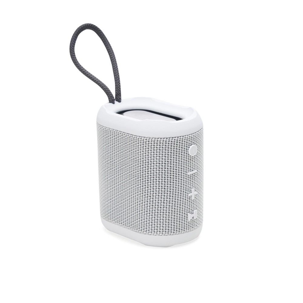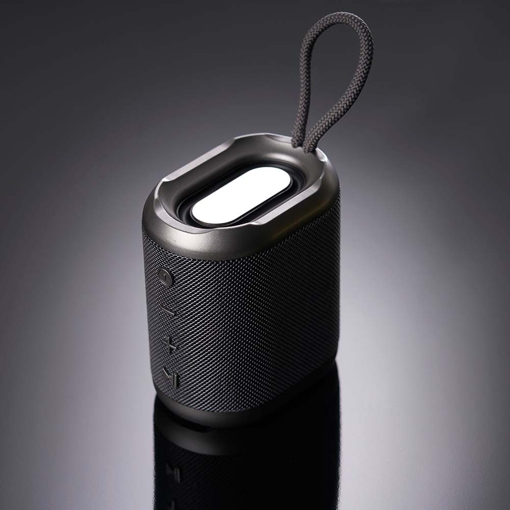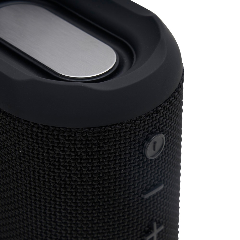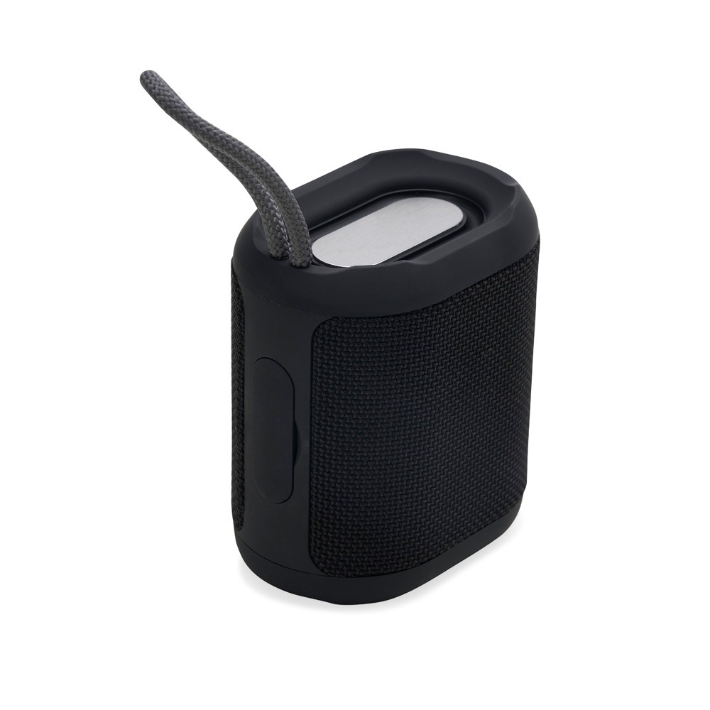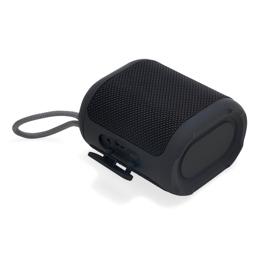 Caixa de som multimídia resistente a respingos dágua feito em plástico com acabamento em tecido. Possui conexão via Bluetooth 5.0 e compatibilidade com a tecnologia TWS, que permite sincronizar duas caixas de som ao mesmo tempo. Conta ainda com modo de reprodução de arquivos MP3 a partir das entradas para cartão TF (microSD) e USB para pen drives. Acompanha cabo Micro-USB e cabo auxiliar P2.