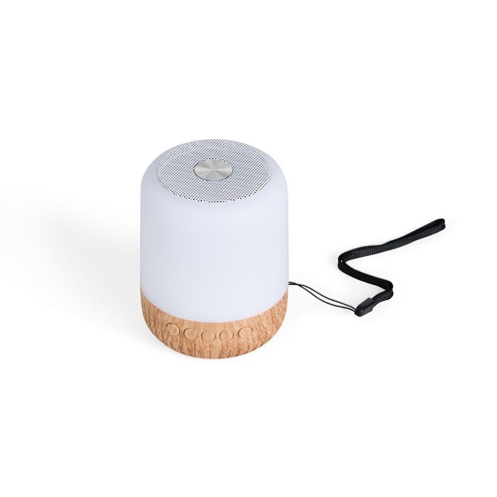 Caixa de som multimídia sem fio em plástico com detalhes que remetem à textura de madeira e um anel antiderrapante colado à base. Conta com iluminação em LED e painel de botões para alternância entre os modos Bluetooth, rádio FM e reprodução de arquivos MP3 a partir das entradas para cartão TF (microSD) e USB para pen drives. Acompanha cabo micro-USB para carregamento.