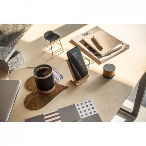 Caixa de som portátil em bambu e ABS 100% reciclado com microfone e autonomia de 4h30 Caixa de som portátil com microfone, em bambu e ABS 100% reciclado, com transmissão sem fios BT 5.3. Tem potência de 3W, bateria com 400 mAh e autonomia aproximada de 4h30. Permite ainda as funções de atender chamadas, leitor de cartões microSD, entrada AUX e reprodução automática via porta USB-A. Incluso cabo de carregamento USB-C. Fornecido em caixa presente de papel kraft reciclado, que pode ser reutilizada como suporte de celular. A grelha é fornecida solta para pedidos não personalizados. A cor e o resultado da impressão nos materiais naturais pode variar entre produtos. ø60 x 58 mm | Caixa: 65 x 63 x 75 mm
