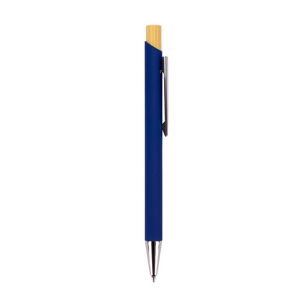 Caneta esferográfica em metal com ponta touch escrita em azul.