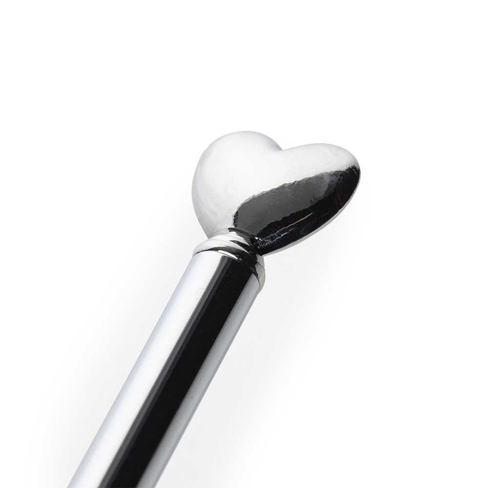 Caneta metálica com carga esferográfica azul e acionamento por rotação.