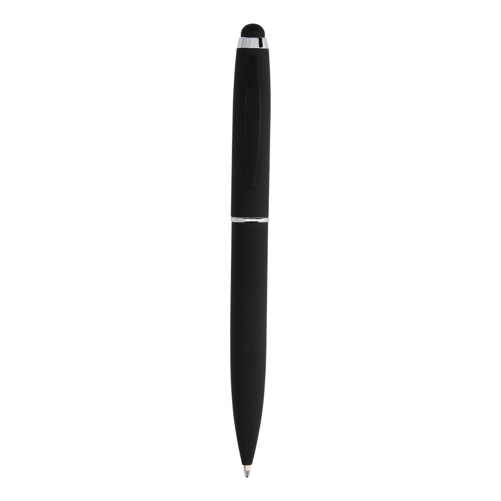 Caneta metálica touchscreen com acionamento por rotação e carga esferográfica azul 1mm.