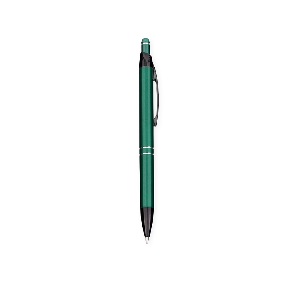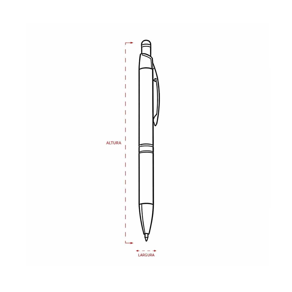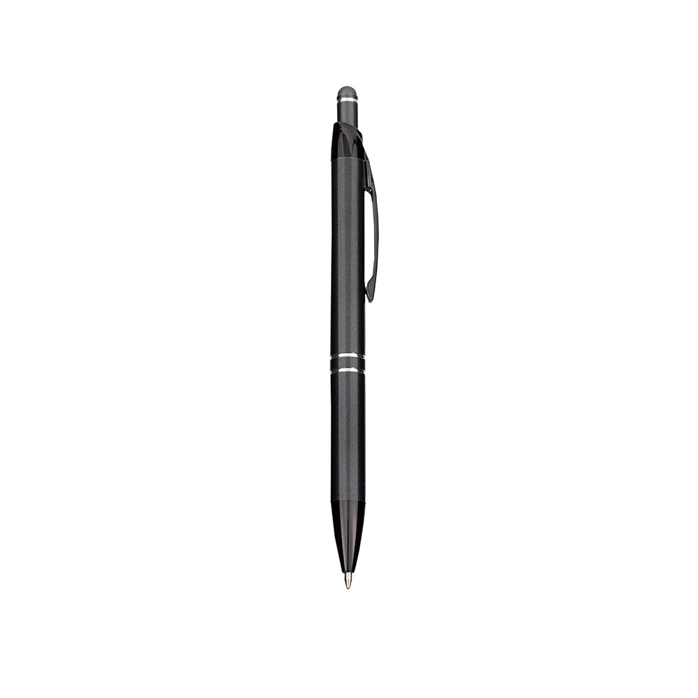 Caneta em metal com clip e ponta em plástico, além de detalhe emborrachado no topo para interação com dispositivos de telas sensíveis ao toque. Conta ainda com acionamento por clique e carga esferográfica azul de 1,0mm.