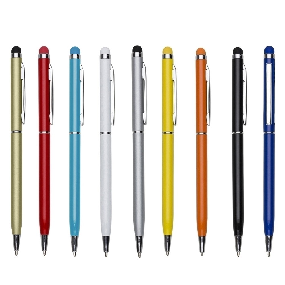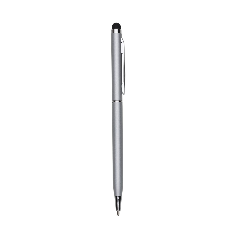 Caneta metálica com touch screen, carga esferográfica azul 1.0 mm e acionamento por rotação.