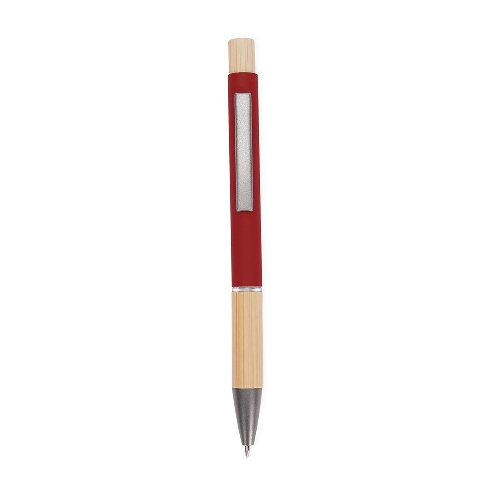 Caneta com carga esferográfica azul de 1.0mm. Apresenta corpo metálico, detalhes em bambu e acionamento por clique, oferecendo uma pegada leve para uma escrita precisa.
