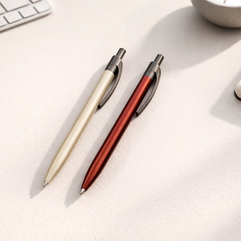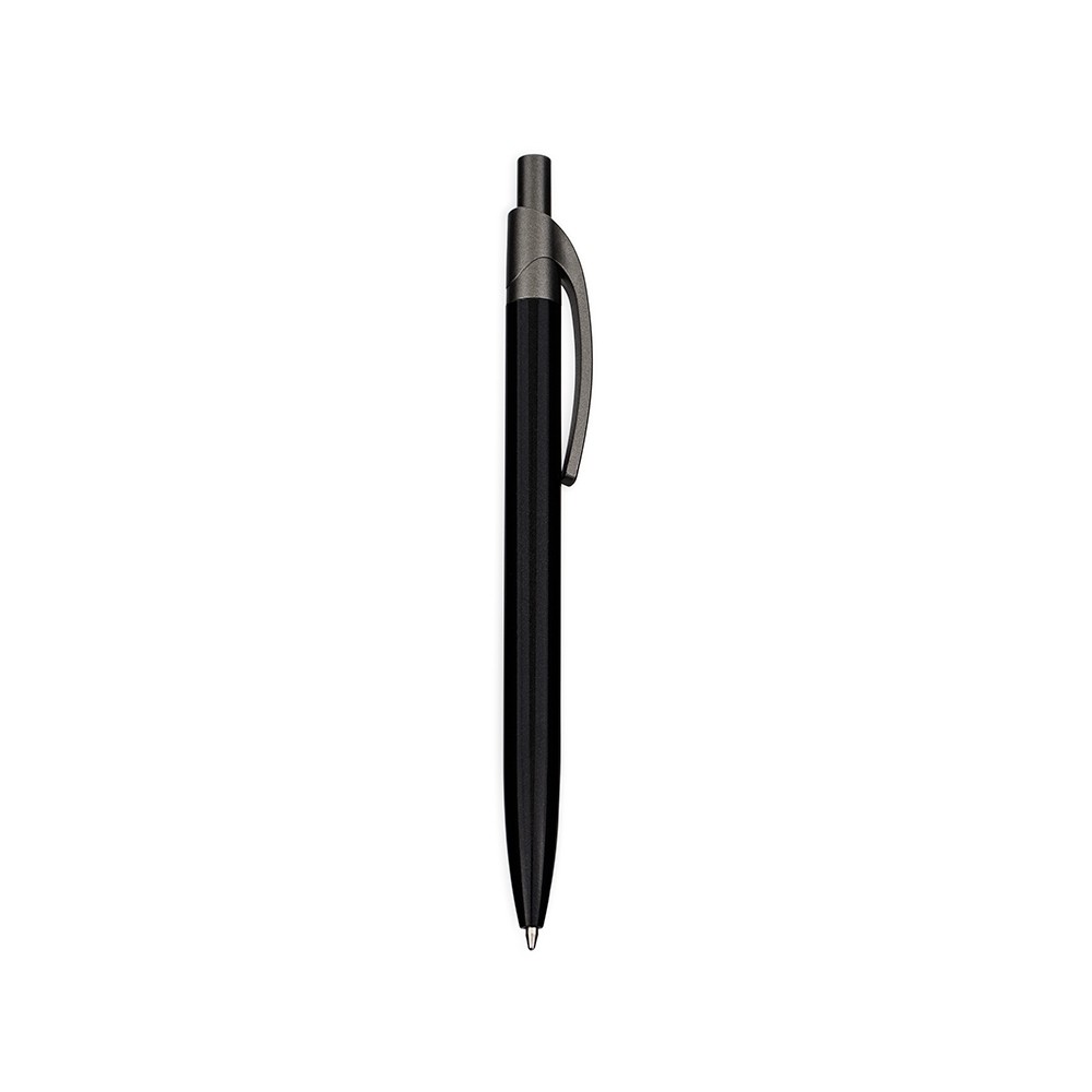 Caneta metálica com acionamento por clique e clip em plástico. Possui carga esferográfica azul de 1,0mm.