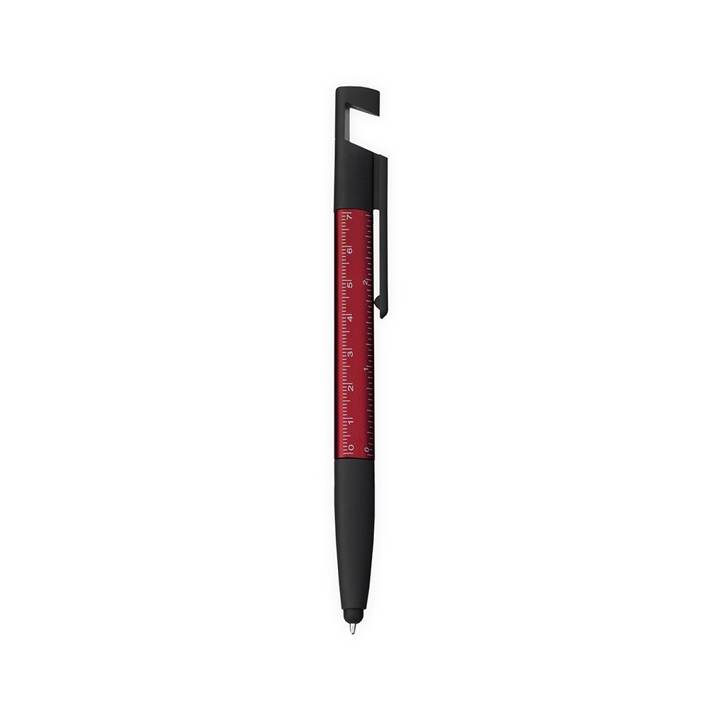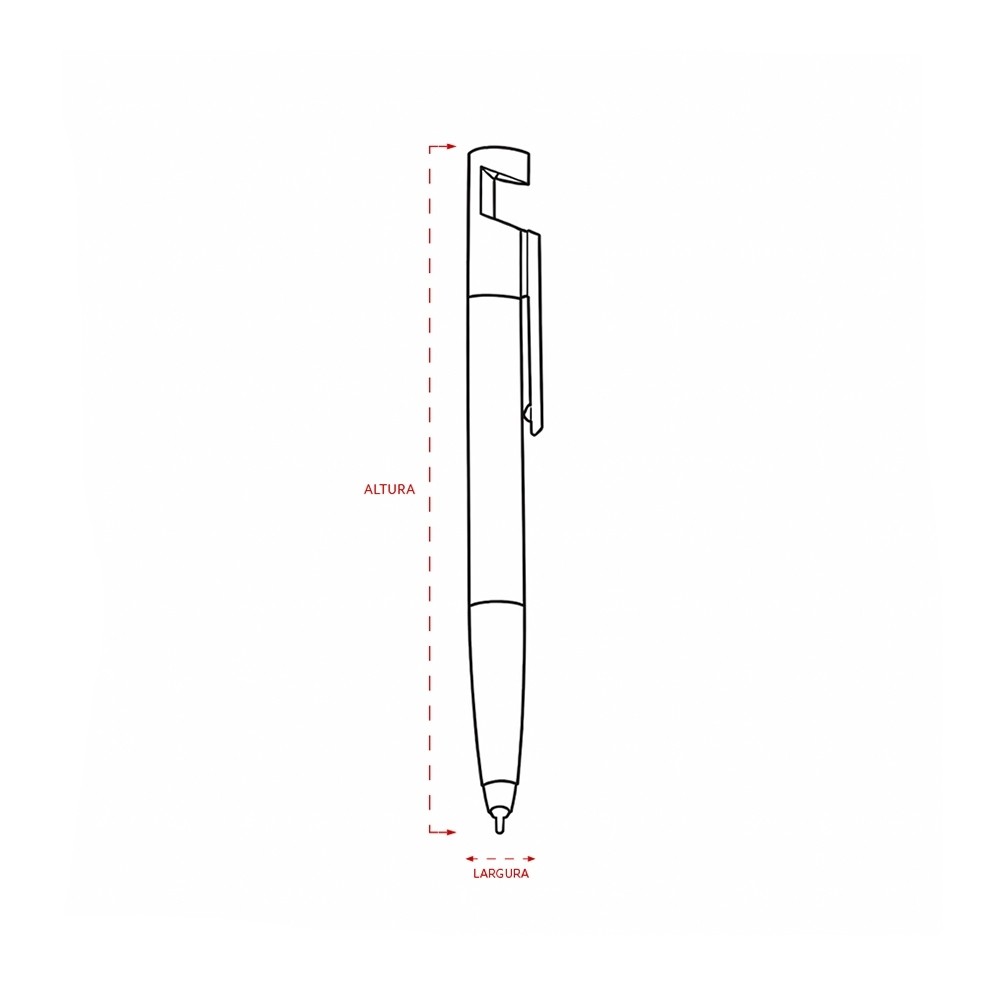 Caneta plástica triangular com ponteira emborrachada para interação em dispositivos de telas sensíveis ao toque. Possui clip com revestimento em feltro no topo, ideal para limpeza de tela, além de abertura que funciona como suporte para celular. Conta ainda com marcação de régua de 7 cm no corpo, acionamento por rotação e carga esferográfica azul de 1,0mm.