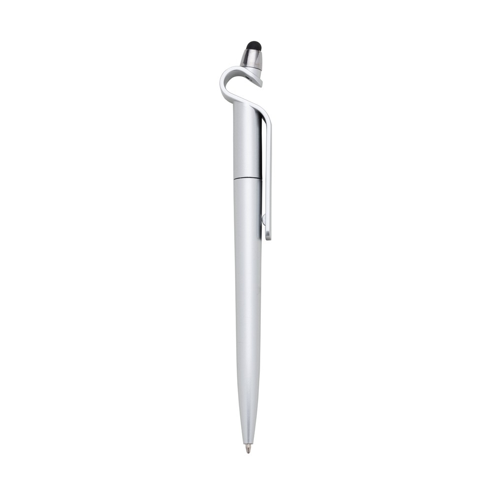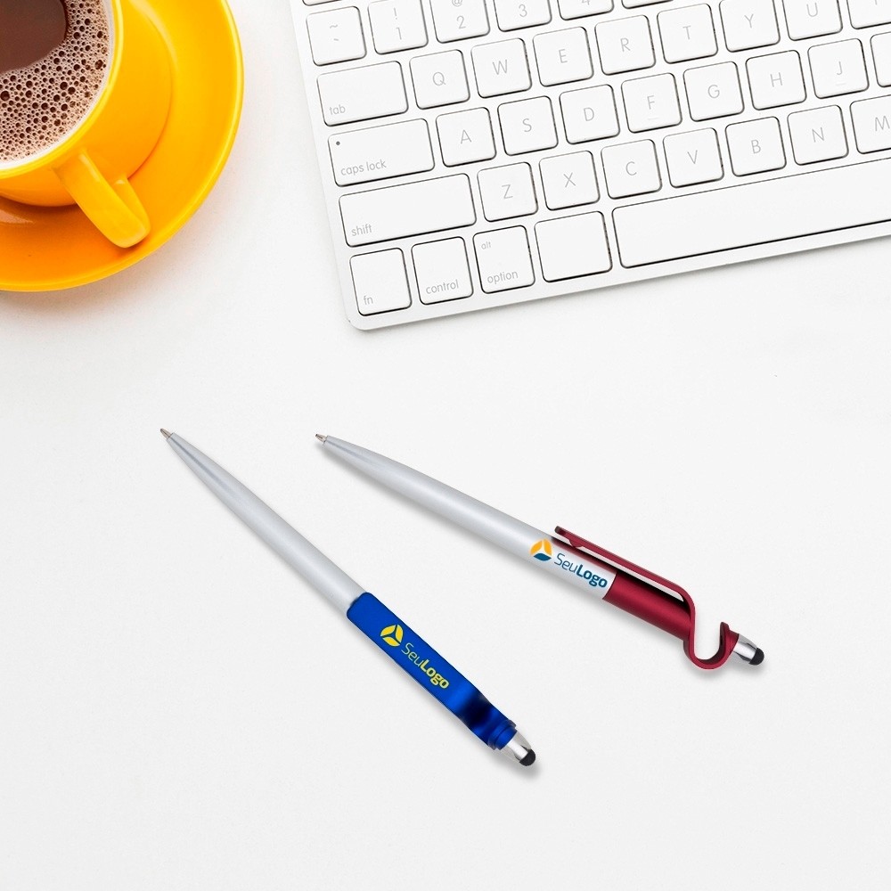 Caneta plástica com suporte para celular e touch screen. Carga esferográfica azul e acionamento por rotação.