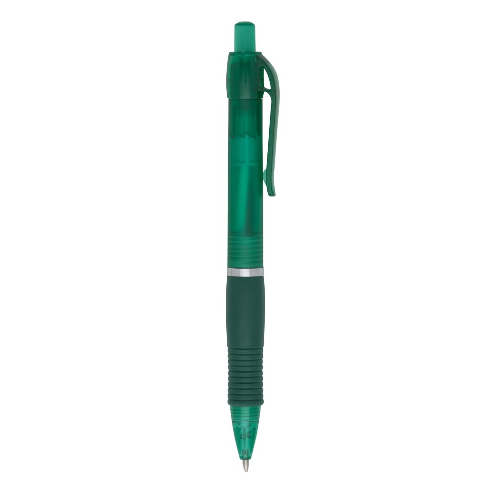 Caneta plástica com detalhe emborrachado, carga esferográfica azul 1.0 mm e acionamento por clique.