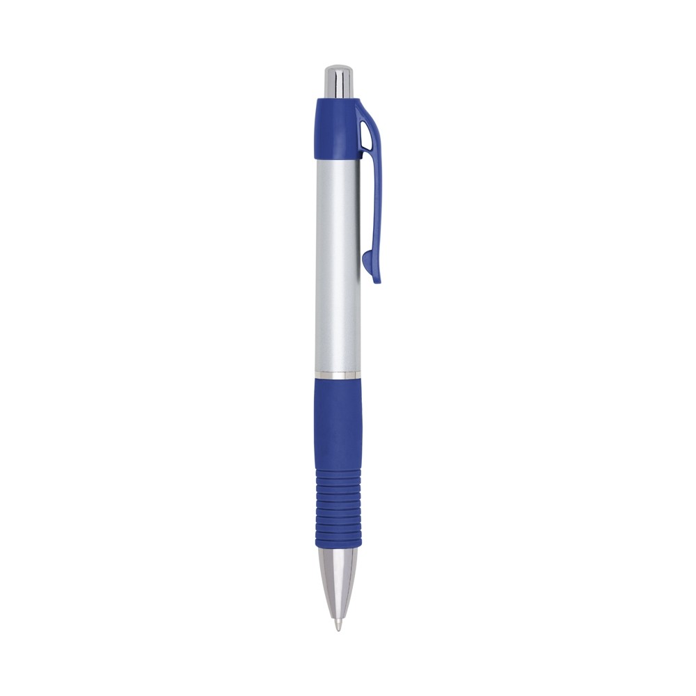Caneta plástica com detalhe emborrachado, carga esferográfica azul 1.0 mm e acionamento por clique. Especificações: - Medidas aproximadas para gravação(CxL)  3 cm x 0,8 cm - Tamanho total aproximado(CxL)  14 cm x 1,6 cm - Peso aproximado(g)  9