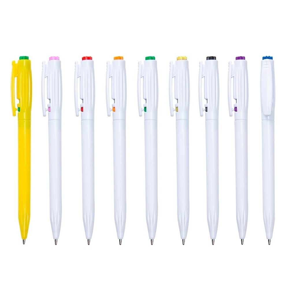 Caneta plástica com carga esferográfica azul 1.0 mm e acionamento por clique.