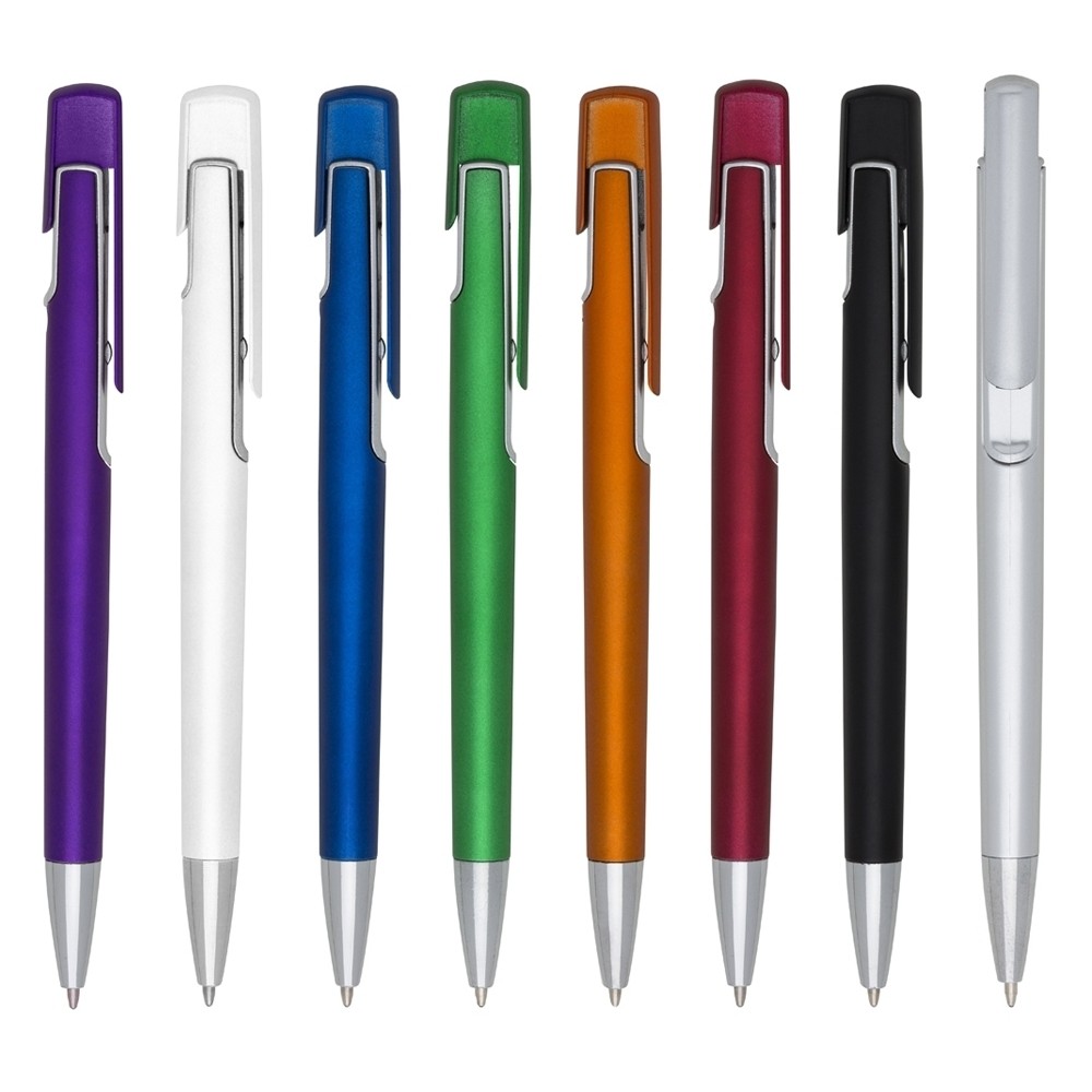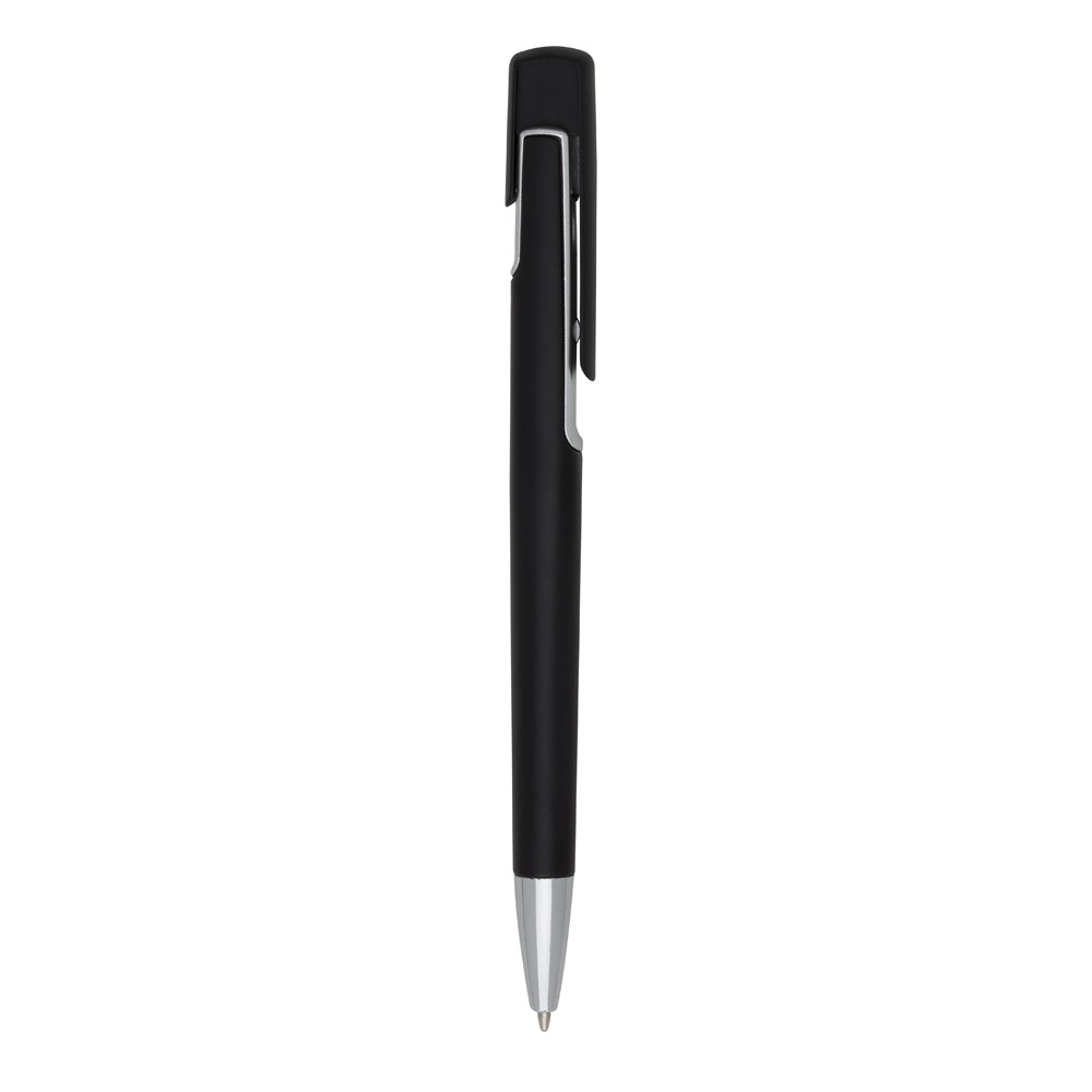 Caneta plástica com carga esferográfica azul 1.0 mm e acionamento por clique.