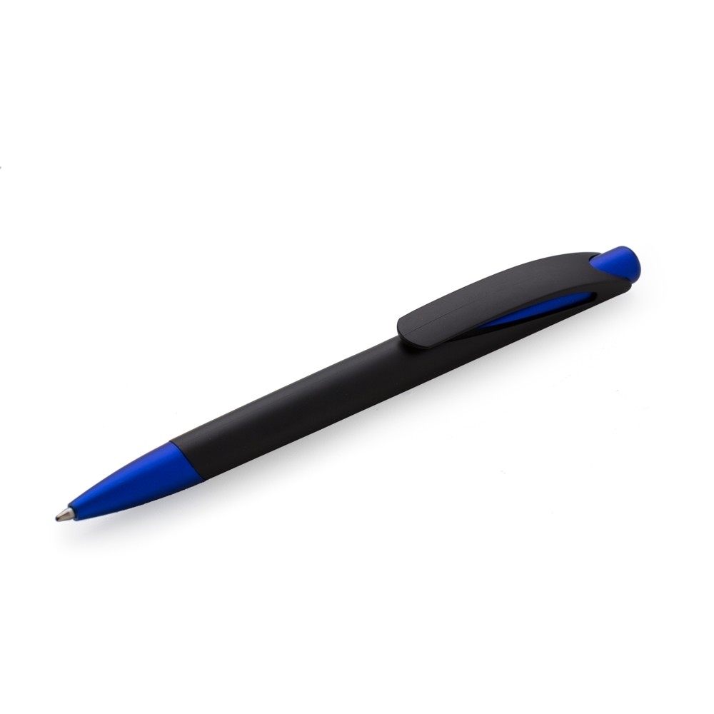 Caneta plástica com carga esferográfica azul 1.0 mm e acionamento por clique.