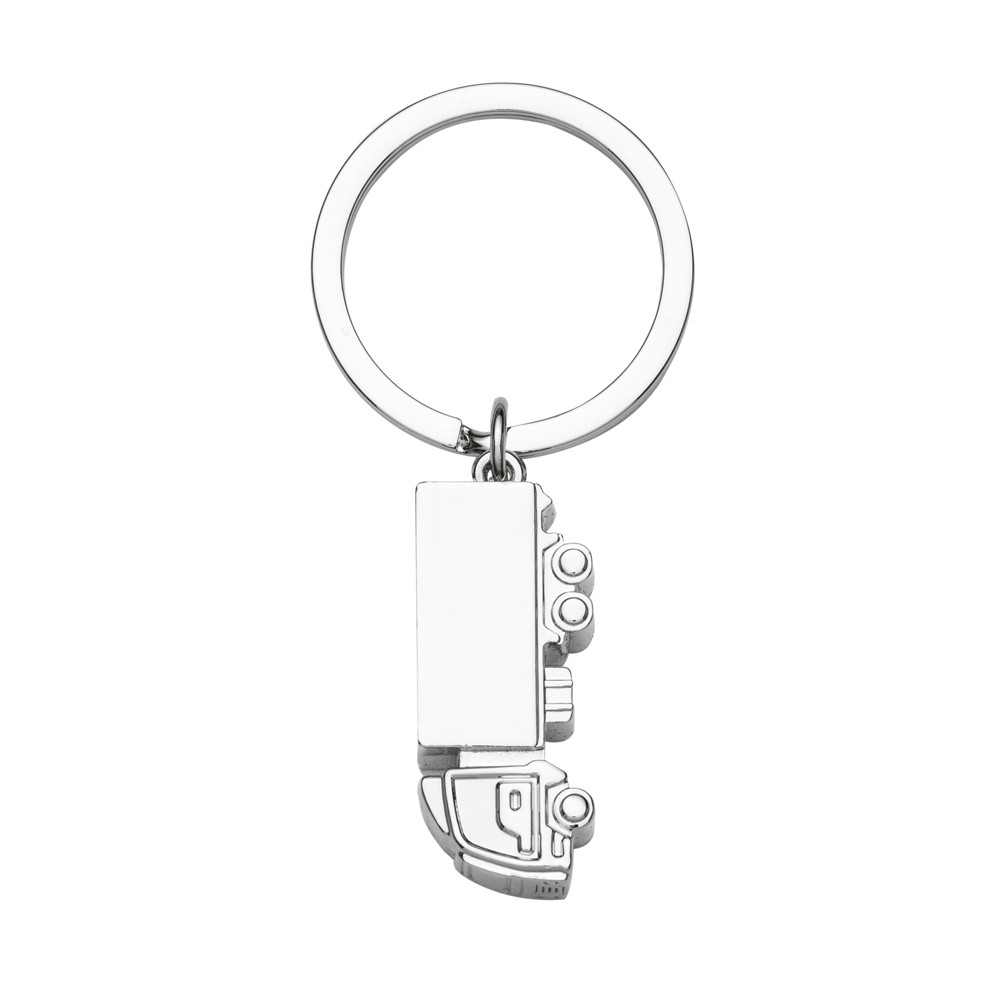 Chaveiro metálico brilhante e compacto, com formato de caminhão e argola em ferro, próprio para organizar chaves ou como objeto decorativo.