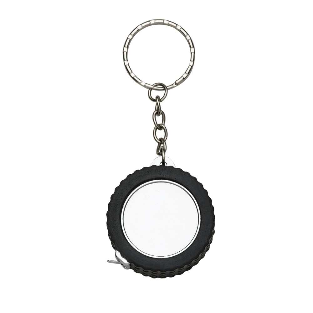 Chaveiro plástico em formato de pneu de carro e argola metálica. Possui uma trena com fita de alcance máximo de 1 metro, além de exibir suas medidas em pés e polegadas. Especificações: - Largura  4,1 cm - Comprimento  c/ argola 10cm - Espessura  1,6 cm - Medidas aproximadas para gravação(CxL)  2,6 cm x 2,6 cm - Tamanho total aproximado(CxL)  10,1 cm x 4,1 cm - Peso aproximado(g)  24