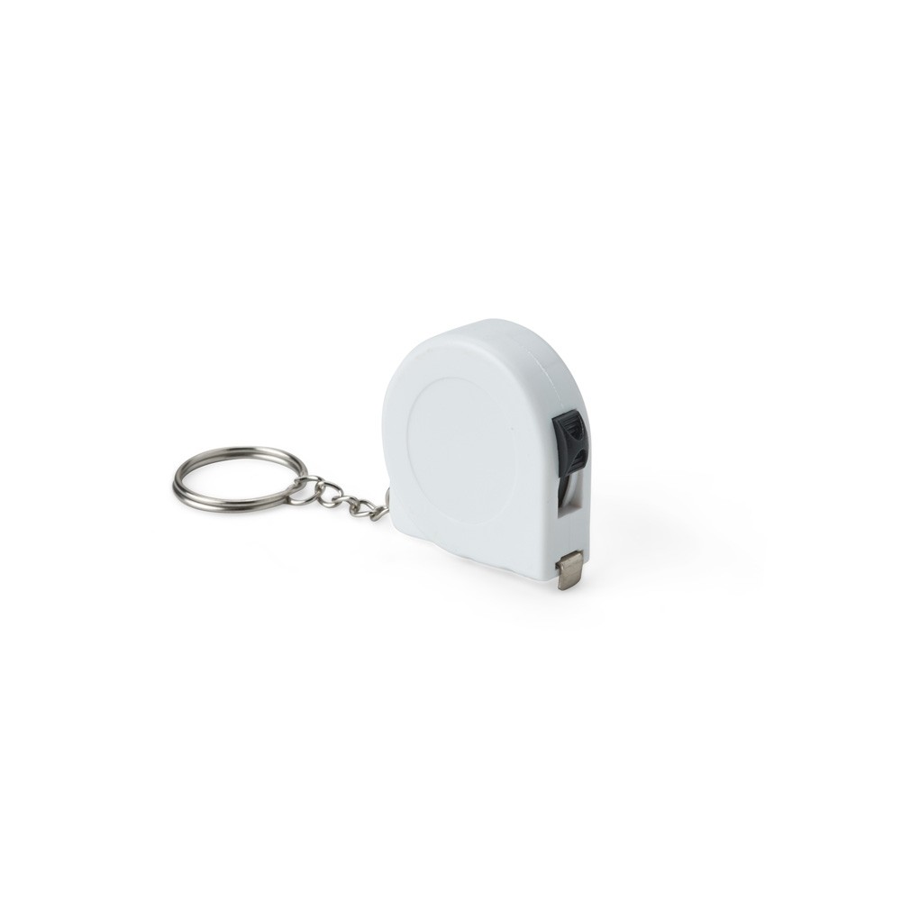 Chaveiro trena em plástico com argola metálica e fita de aço para medição com alcance de até 2 metros e marcações em pés e polegadas.