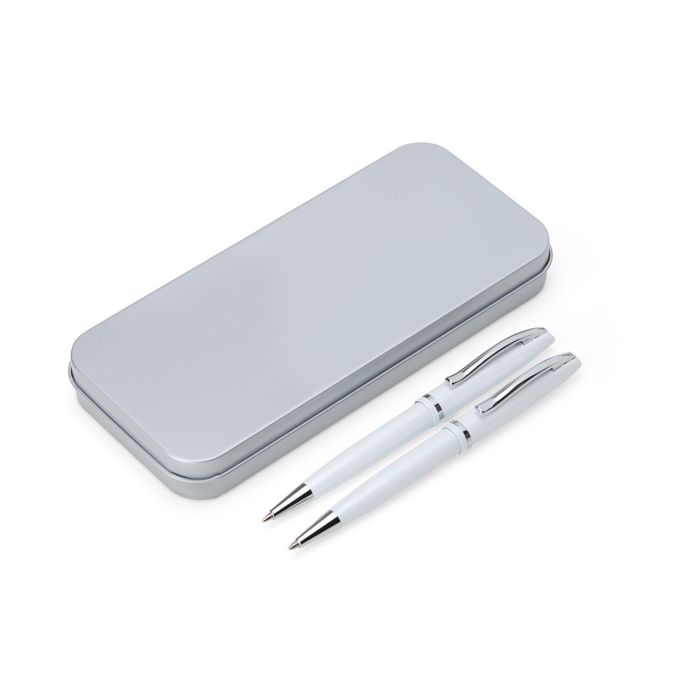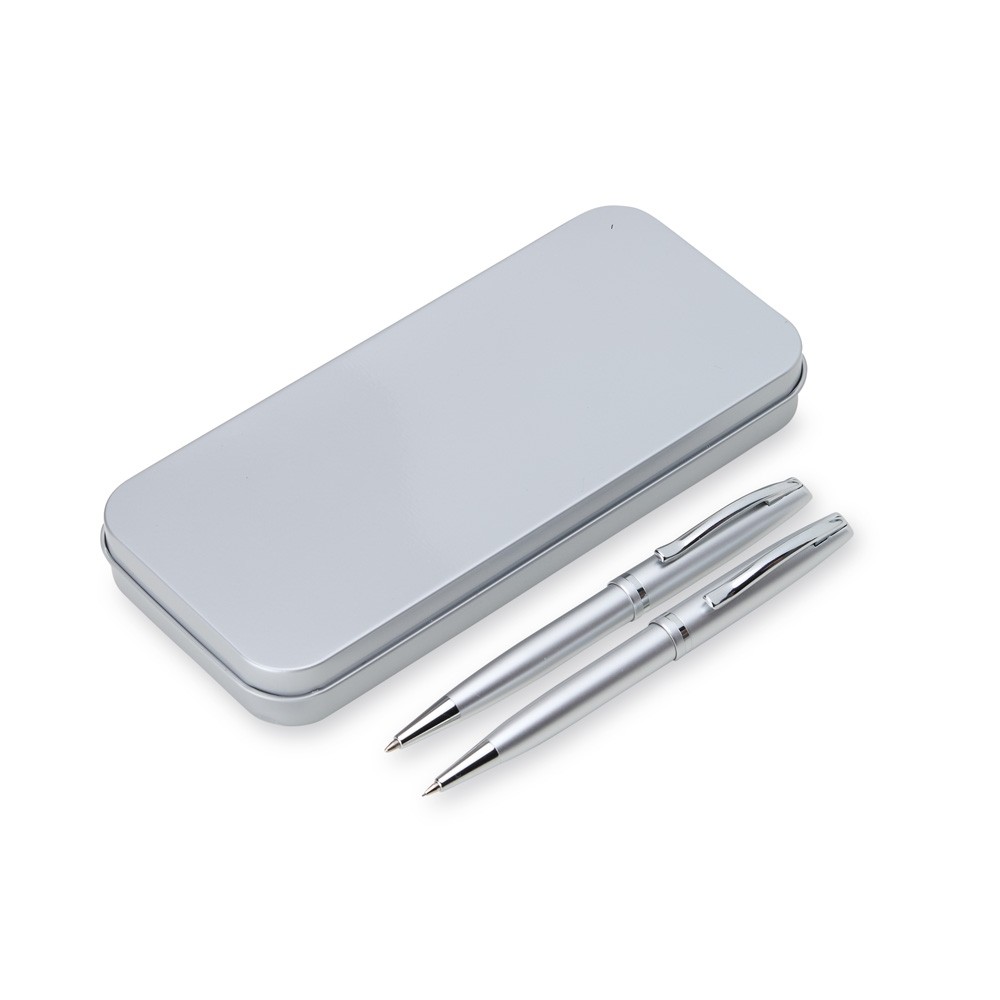 Conjunto de caneta e lapiseira metálicas em estojo metal. Caneta e lapiseira possuem acabamento brilhante, carga esferográfica azul de 1.0mm e acionamento por rotação.