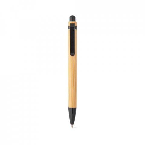 Conjunto de caderno A5 e esferográfica em bambu. O caderno de capa e contracapa em placa de bambu e lombada em poliéster 100% reciclado, contém 192 páginas pautadas em papel 100% reciclado, suporte para esferográfica (inclusa) e elástico para fecho do caderno. Esferográfica em bambu e escrita em preto. Fornecido em caixa presente de oferta de papel kraft reciclado. A cor e o resultado da impressão nos materiais naturais pode variar entre produtos. Caderno: 140 x 210 mm | Esferográfica: ø11 x 138 mm | Caixa de oferta: 160 x 255 x 18 mm