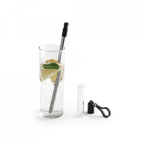 Conjunto de canudo em aço inox e escova de limpeza. Fornecido em estojo com mosquetão. Certificação EU Food Grade. Canudo: ø9 x 218 mm | Estojo: ø10 x 105 mm
