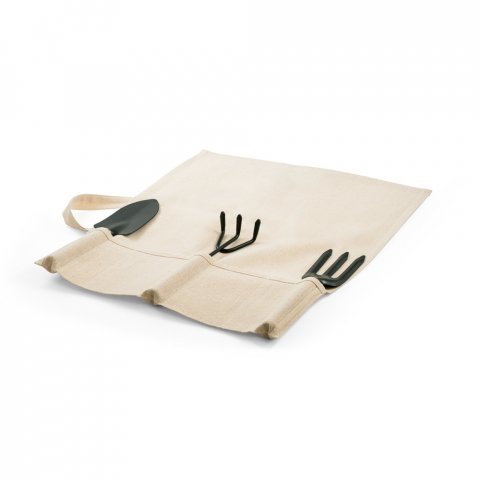 Conjunto de jardinagem com 3 ferramentas em metal e madeira de eucalipto: pá, rastelo e garfo. Incluso bolsa em 100% algodão (180 g/m²) com fita para fechar. Fornecido desmontado. Bolsa: 130 x 600 mm | Pá: 60 x 254 mm | Ancinho: 63 x 215 mm | Forquilha: 57 x 245 mm