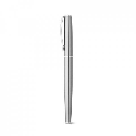 Conjunto de roller e esferográfica com corpo em aço inox 53% reciclado e clipe. A esferográfica tem mecanismo twist e escrita até 1.5 km. O conjunto tem escrita em preto. Fornecido em caixa presente de papel kraft proveniente de uma gestão florestal sustentável. Roller: ø11 x 130 mm | Esferográfica: ø11 x 131 mm | Caixa: 150 x 45 x 20 mm