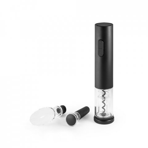 Conjunto de saca-rolhas elétrico e acessórios em ABS e TPE. Incluso corta cápsulas, rolha de vácuo e salva-gotas (pilhas inclusas). Fornecido em caixa presente. Saca rolhas: 45 x 227 mm | Caixa: 241 x 90 x 54 mm