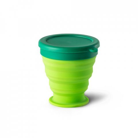 Copo de viagem em silicone 240 mL Copo de viagem dobrável em silicone com tampa em PP. Contém uma argola na base que serve como pega ou para pendurar. Capacidade até 240 mL. Certificação EU Food Grade. ø57 x 87 x 81 mm